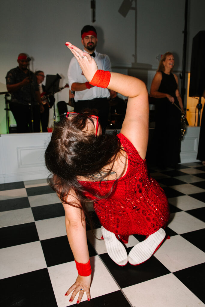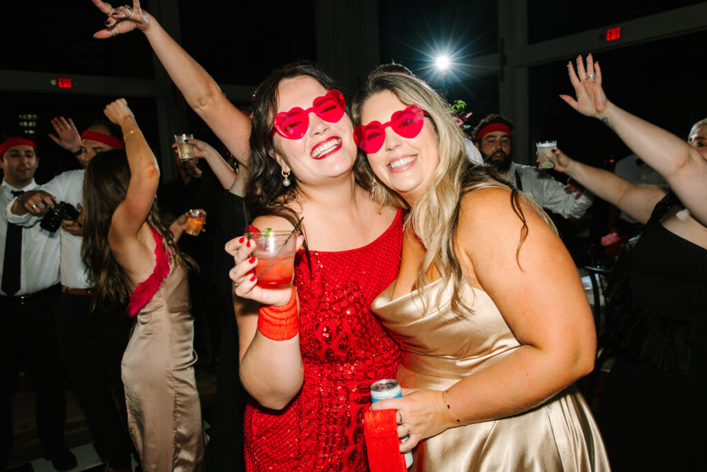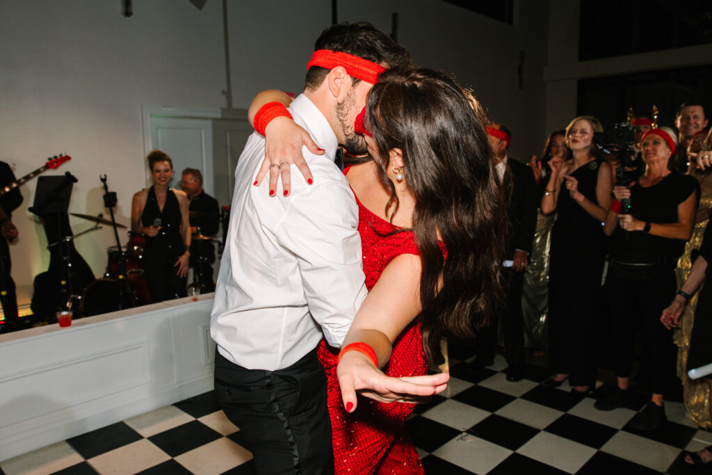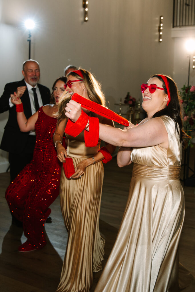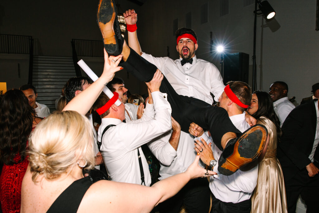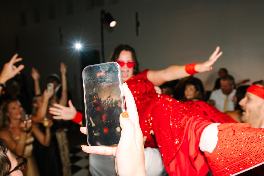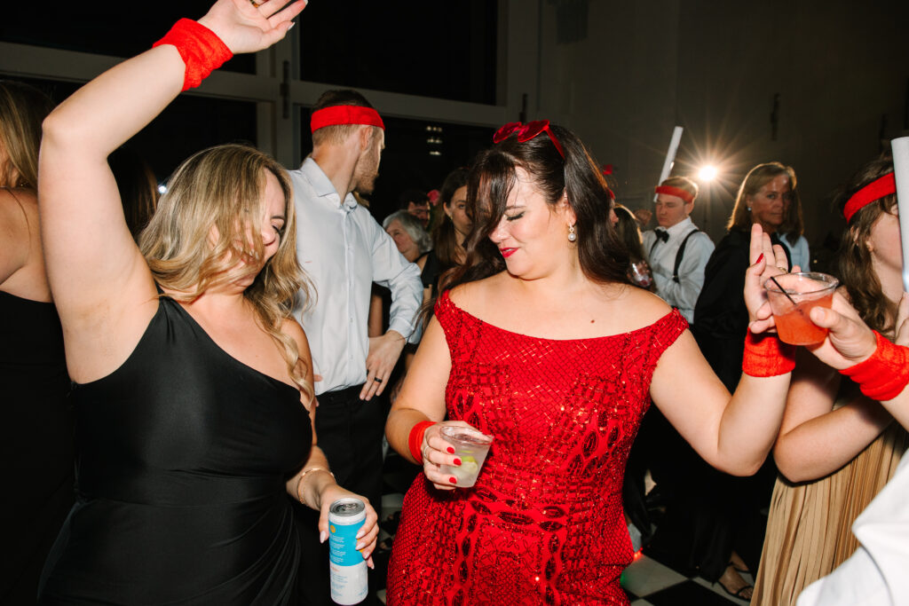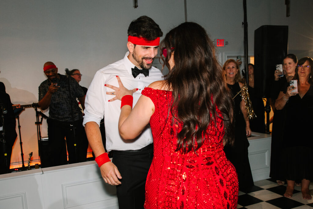 Then came the moment everyone was waiting for… the celebration. And oh my goodness, did this group know how to party! The Emerald Empire Band kept the dance floor packed all night long — no one even thought about sitting down. Lauren was the most ICONIC bride and surprised everyone by changing into a bright red, bejeweled jumpsuit (because how else are you supposed to do the splits during “London Bridge” by Fergie?). And to top it all off, they passed out red sweatbands for everyone to wear on the dance floor — easily one of the most fun, high-energy receptions we’ve ever photographed. You bet I was in the middle of it all taking photos and dancing alongside them!