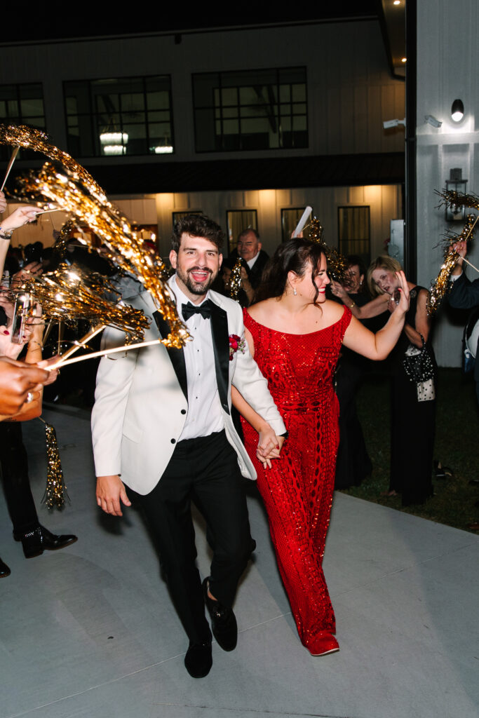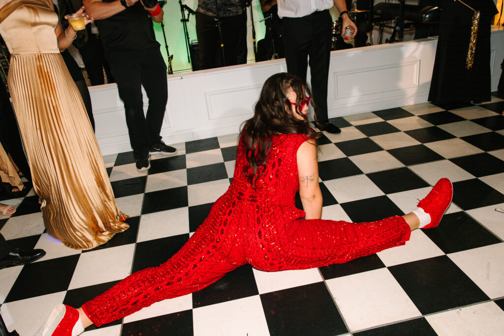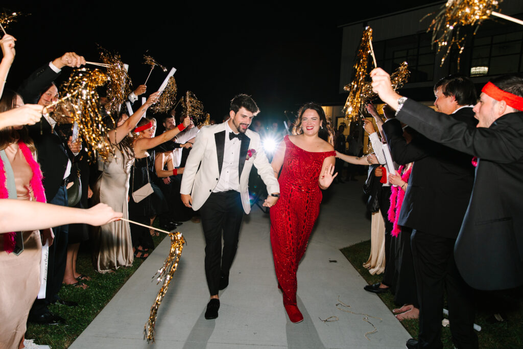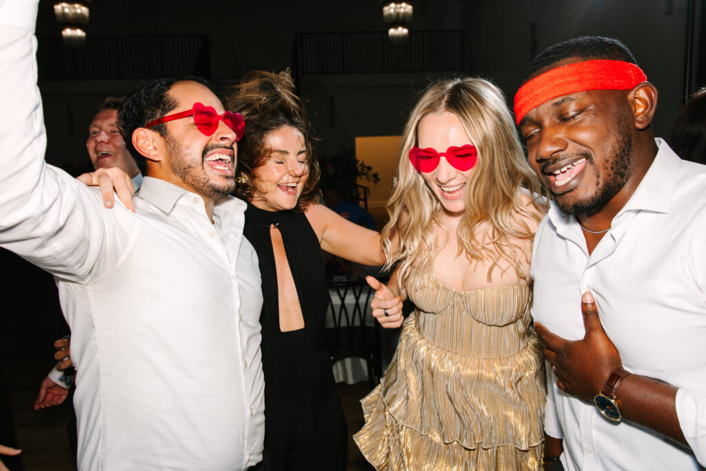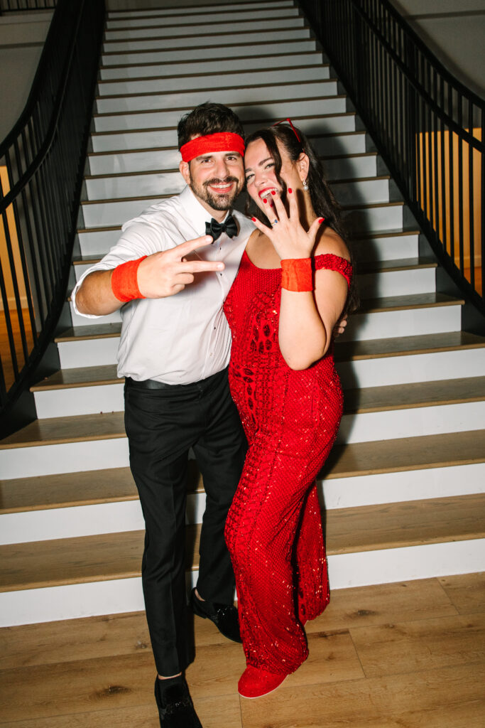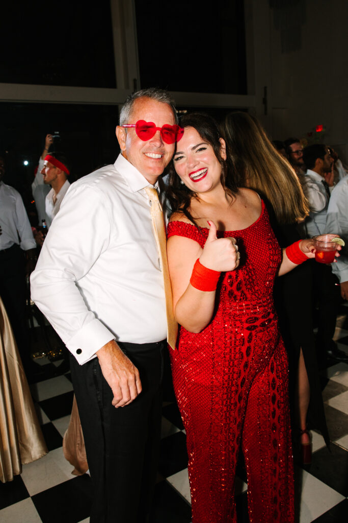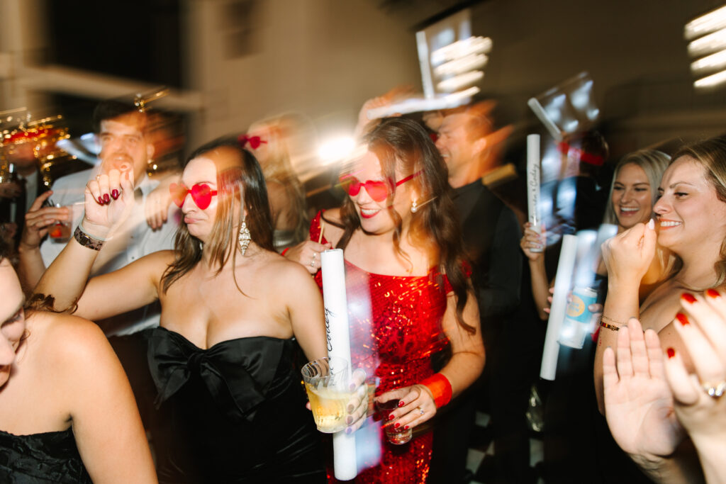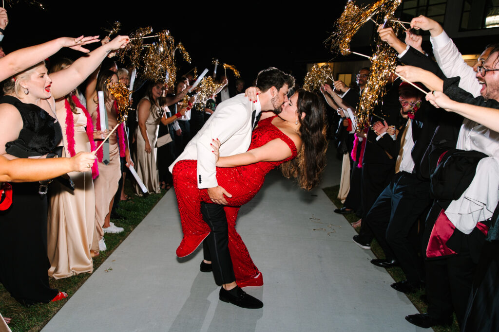 Then came the moment everyone was waiting for… the celebration. And oh my goodness, did this group know how to party! The Emerald Empire Band kept the dance floor packed all night long — no one even thought about sitting down. Lauren was the most ICONIC bride and surprised everyone by changing into a bright red, bejeweled jumpsuit (because how else are you supposed to do the splits during “London Bridge” by Fergie?). And to top it all off, they passed out red sweatbands for everyone to wear on the dance floor — easily one of the most fun, high-energy receptions we’ve ever photographed. You bet I was in the middle of it all taking photos and dancing alongside them!